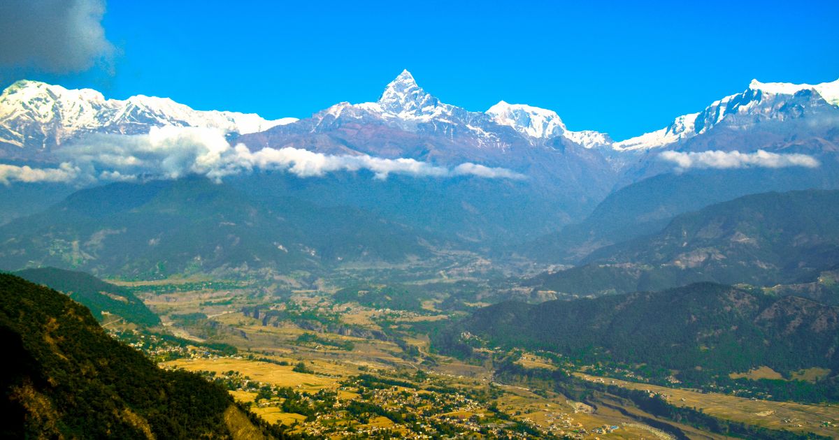 Watch the sun rise behind the majestic peaks of Annapurna, Dhaulagiri, and Machhapuchhre (Fishtail Mountain).